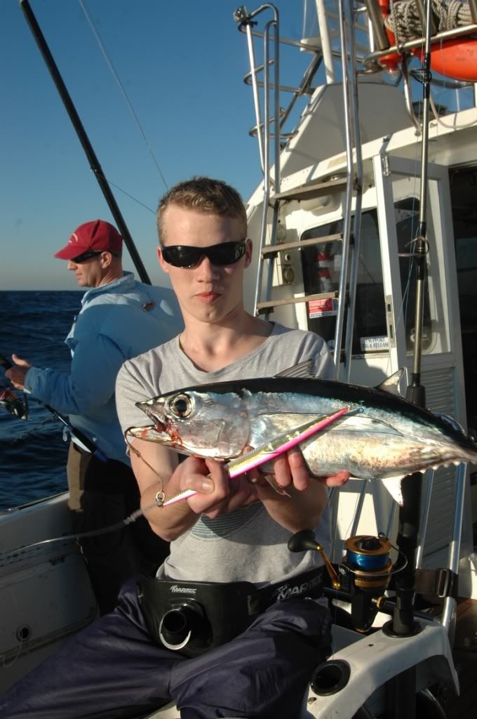 We first went out with Ambition Charters two weeks ago, 'fin the target of course. The yellow fuckers didn't play ball, however we managed some nice albi on jig and cube. I got the fish of the trip at about 25 lb however this was on a pilchard cube. I popped a similar size jigged one off unfortunately, which pushed the one taken on bait into insignificance. Oh well, I had tasted the entree and I want the main course!